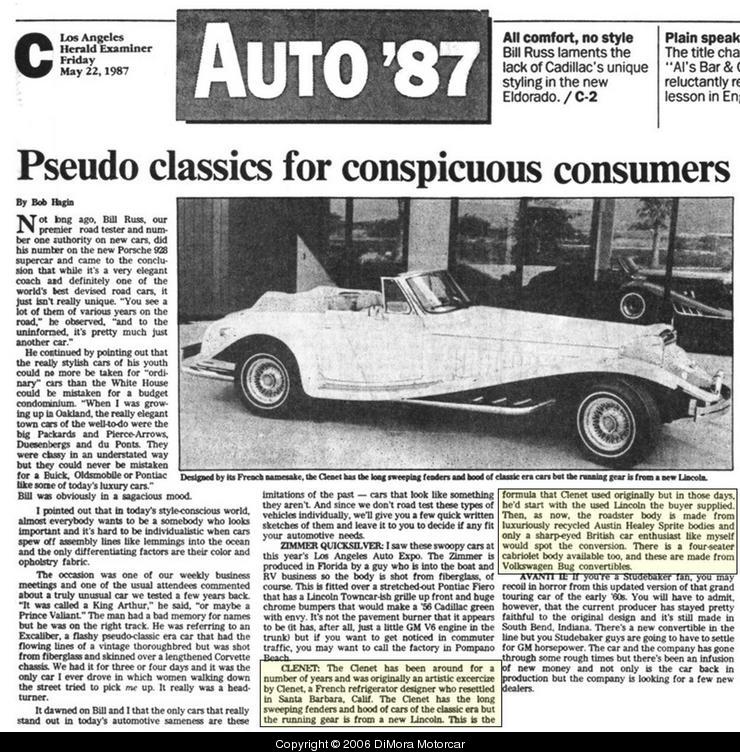 The Los Angeles Herald Examiner critiques the Clenet in May 1987.